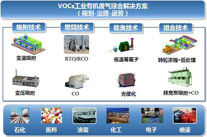 VOCs處理方法有數(shù)十種,其原理主要有回收有價值溶劑的回收技術(shù)和分解VOCs分子的破壞技術(shù)兩大類,實際應用中更多是采用組合式技術(shù)。比如:采用濃縮和燃燒結(jié)合的技術(shù)治理低濃度大風量廢氣,減少裝置投資;采用催化燃燒(CO)或蓄熱式燃燒(RTO)技術(shù)實現(xiàn)低能耗下VOCs的處理;根據(jù)VOCs自身溶解度、沸點等特性選擇變溫吸附或變壓吸附進行溶劑的回收,具體如何選擇取決于客戶生產(chǎn)線的工況。